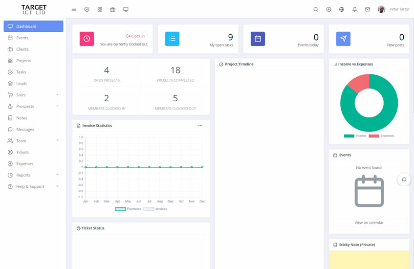 Our sales team, through this same interface is able to manage and track leads while staff are able to view and manage assigned tasks, clock in and out as required and also communicate flawlessly